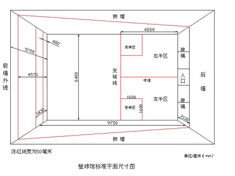 寬6.4米,長9.75米,前高4.57米,后高2.13米,天花高度5~6米,響板高度0.48米,正面發球線高度1.83米,地面發球線距后墻4.26米,半場線將地面發球線與后墻從中心向左右平分,發球區為1.6米見方。